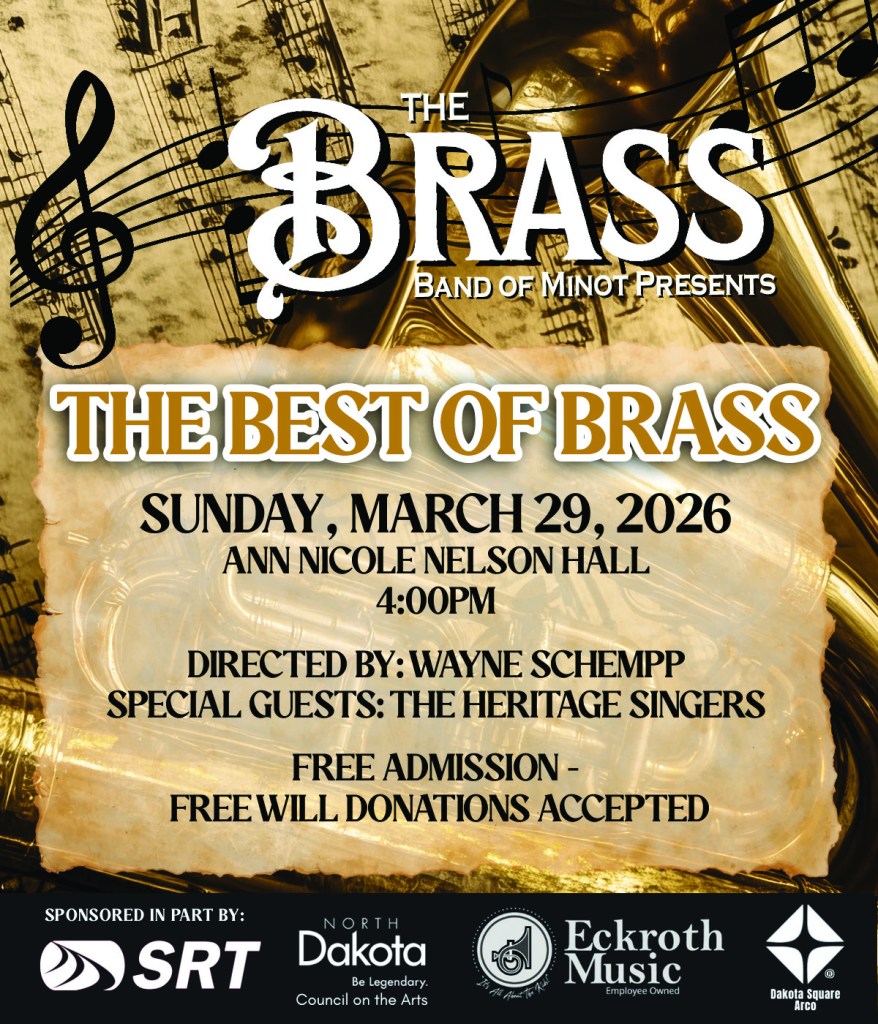 Brass Band of Minot concerts are free and open to the public though cash and check donations are very welcome and help pay for the band’s expenses. The hall has a hearing loop system for hearing aid users and an elevator accessible from the east side of Old Main.